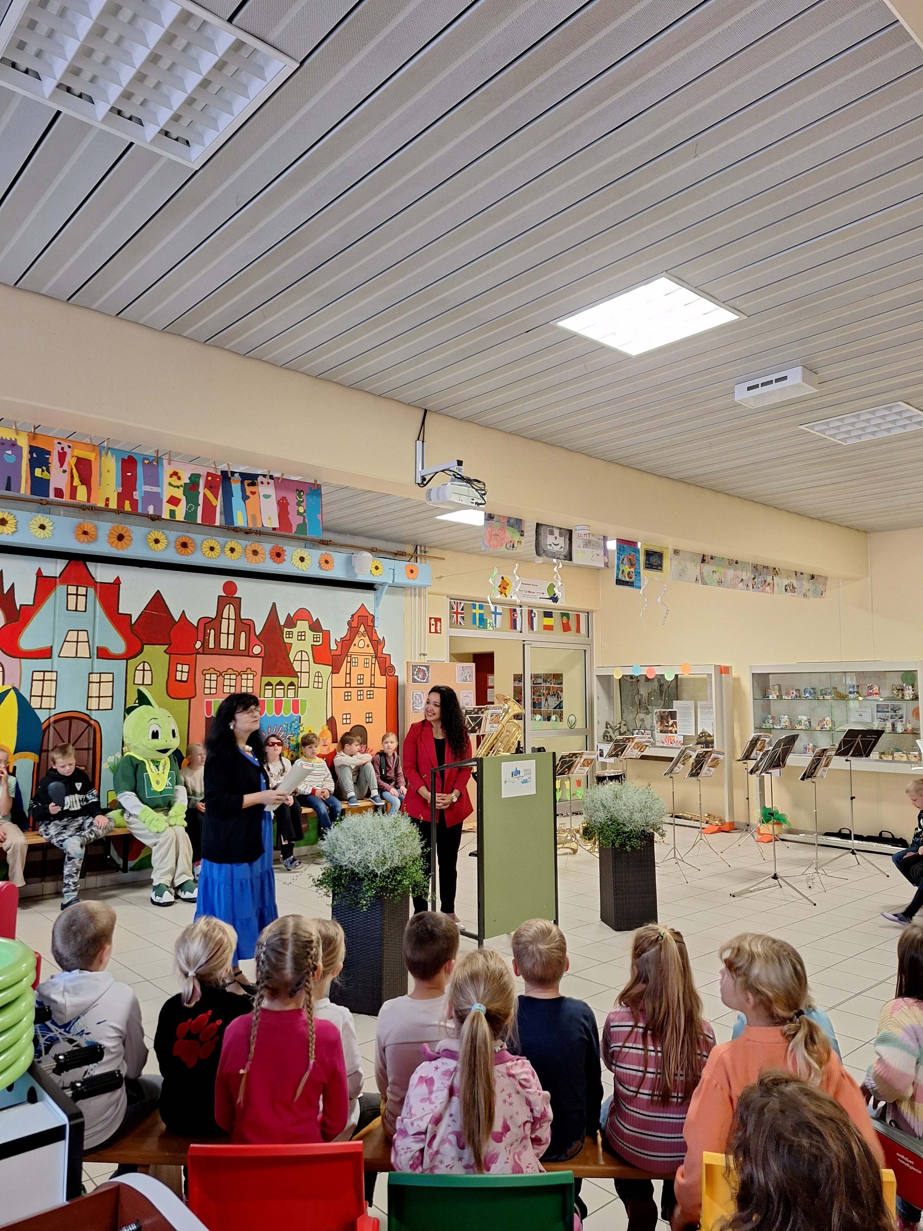 Die Einschulung bringt viele Veränderungen und Neues für unsere Erstklässlerinnen und Erstklässler. Dazu gehört auch der tägliche Weg zur Schule oder zum Bus. Besonders die dunkle Jahreszeit birgt Gefahren für die kleinen Verkehrsteilnehmer. Durch schlechte Sichtverhältnisse und Dunkelheit können Kinder schnell übersehen werden. Aus diesem Grund stattet die AOK Bayreuth-Kulmbach unsere Jüngsten mit reflektierenden Sicherheitsüberwürfen aus. Die Auftaktveranstaltung fand an unserer Grundschule statt. Frau Nazmiye Önal von der AOK erklärte, wie sich die Sichtbarkeit mit diesen Überwürfen deutlich erhöht und wie wichtig daher das Tragen dieser ist. Unter den geladenen Ehrengästen waren unser Bürgermeister Herr Martin Bernreuther, die Jugendverkehrspolizistin Frau Natascha Pohl, die Schulamtsdirektorin Frau Petra Rauh, das Jolinchen sowie weitere Vertreter der AOK und der Verkehrswacht. Bereits seit sechs Jahren arbeitet die AOK Bayern eng mit der Landesverkehrswacht Bayern zusammen, um alle ABC-Schützen mit Sicherheitsüberwürfen auszustatten, in diesem Schuljahr gehen sie an 100 000 Kinder. Für den musikalischen Rahmen sorgte unsere Klasse 4a und die Bläserklasse mit Frau Hermsdörfer. Vielen Dank für diese tolle Aktion!