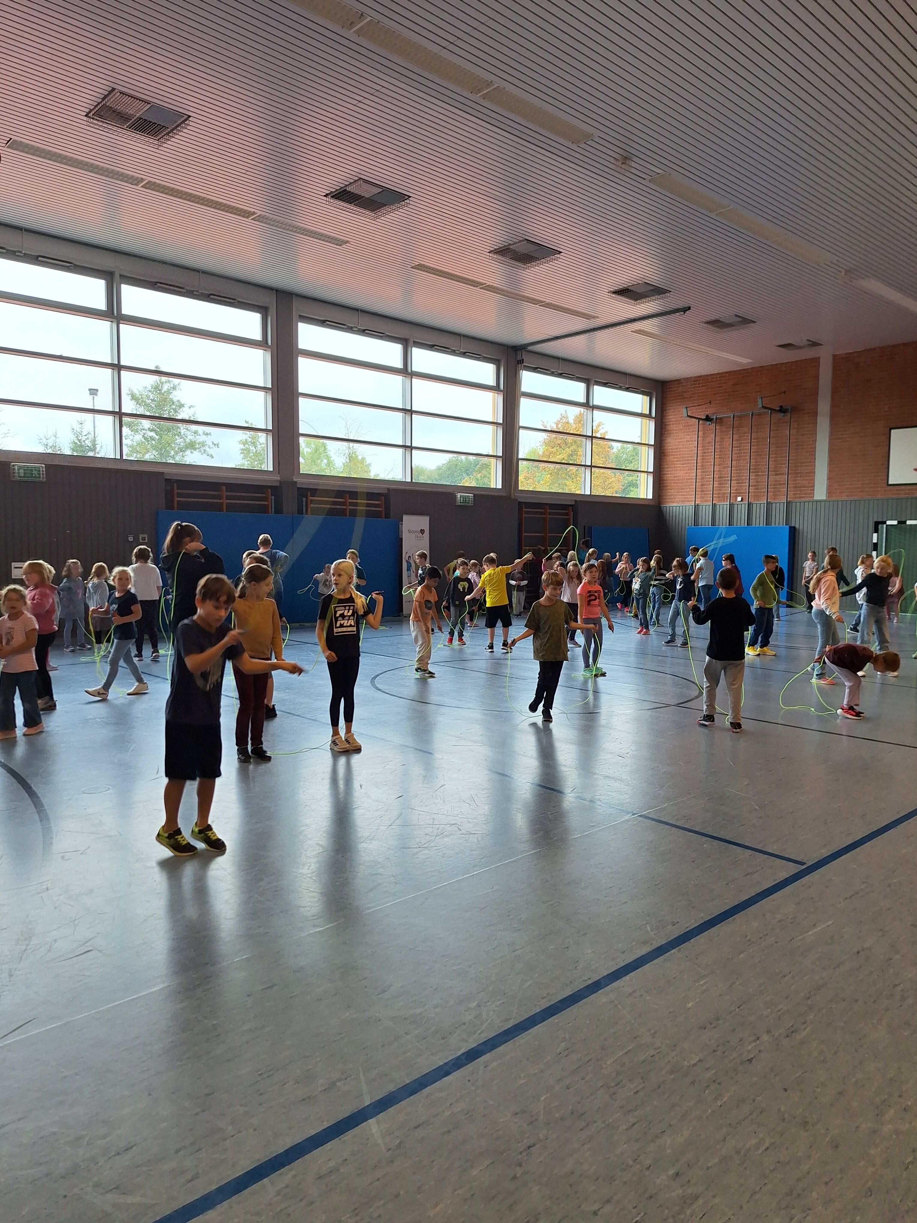Die Deutsche Herzstiftung hat es sich zur Aufgabe gemacht, den natürlichen Bewegungsdrang von Kindern zu fördern. "Skipping Hearts möchte Kinder bewegen und bietet ihnen ein Training im Bereich Rope Skipping (sportliche Form des Seilspringens) an. Seilspringen eignet sich hervorragend, um Kindern eine gute sportmotorische Basis zu vermitteln. Im Team werden Schnelligkeit, Ausdauer und Kraft, aber auch Koordination, Beweglichkeit und das Rhythmusgefühl verbessert." Im Oktober konnten unsere beiden 3. Klassen ihre Herzen richtig "springen" lassen. Gemeinsam mit einer Trainerin übten sich alle im Seilspringen, allein oder im Team. Zum Abschluss gab es eine fetzige Aufführung für die anderen Klassen und jeder durfte sich selbst am Springseil versuchen.