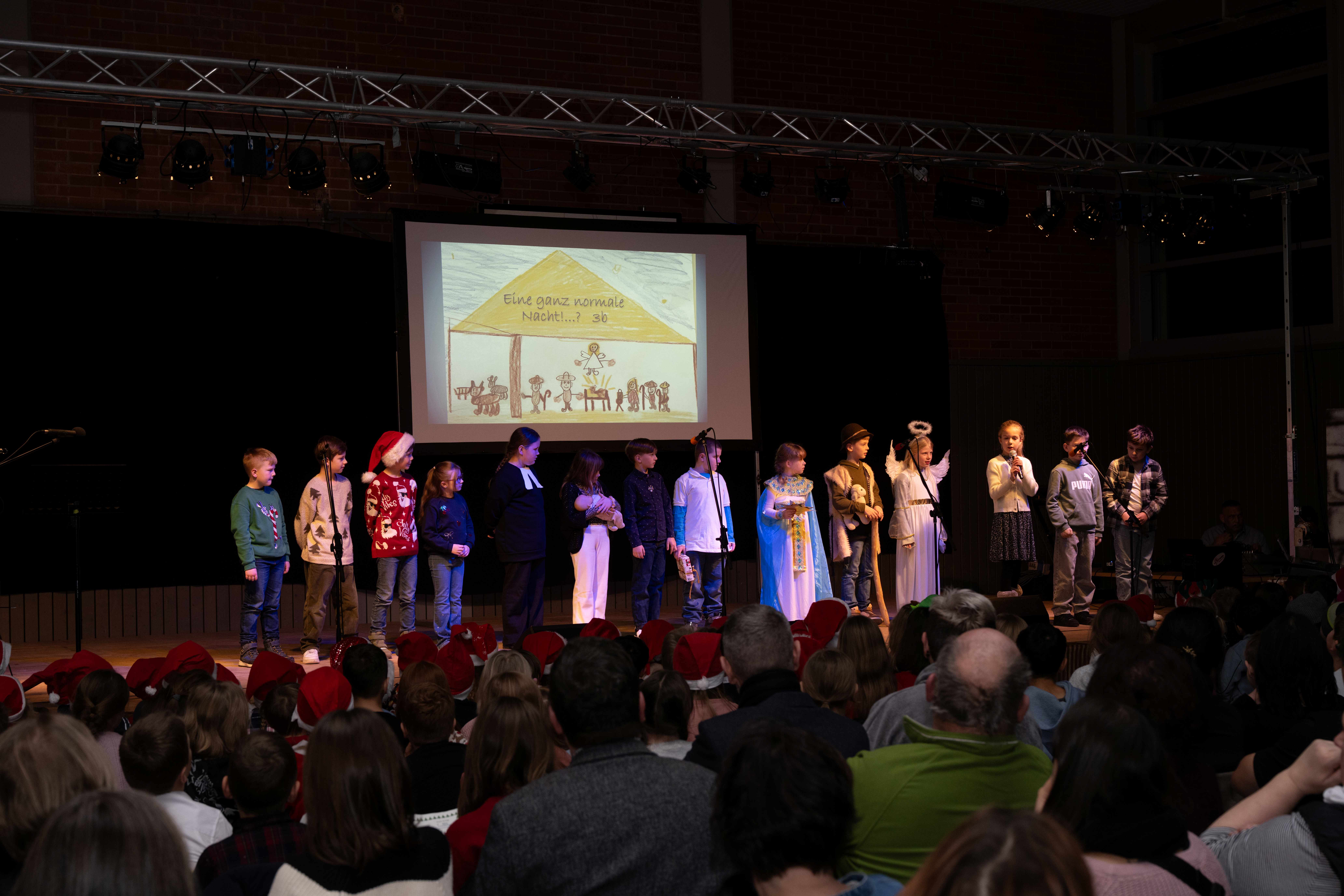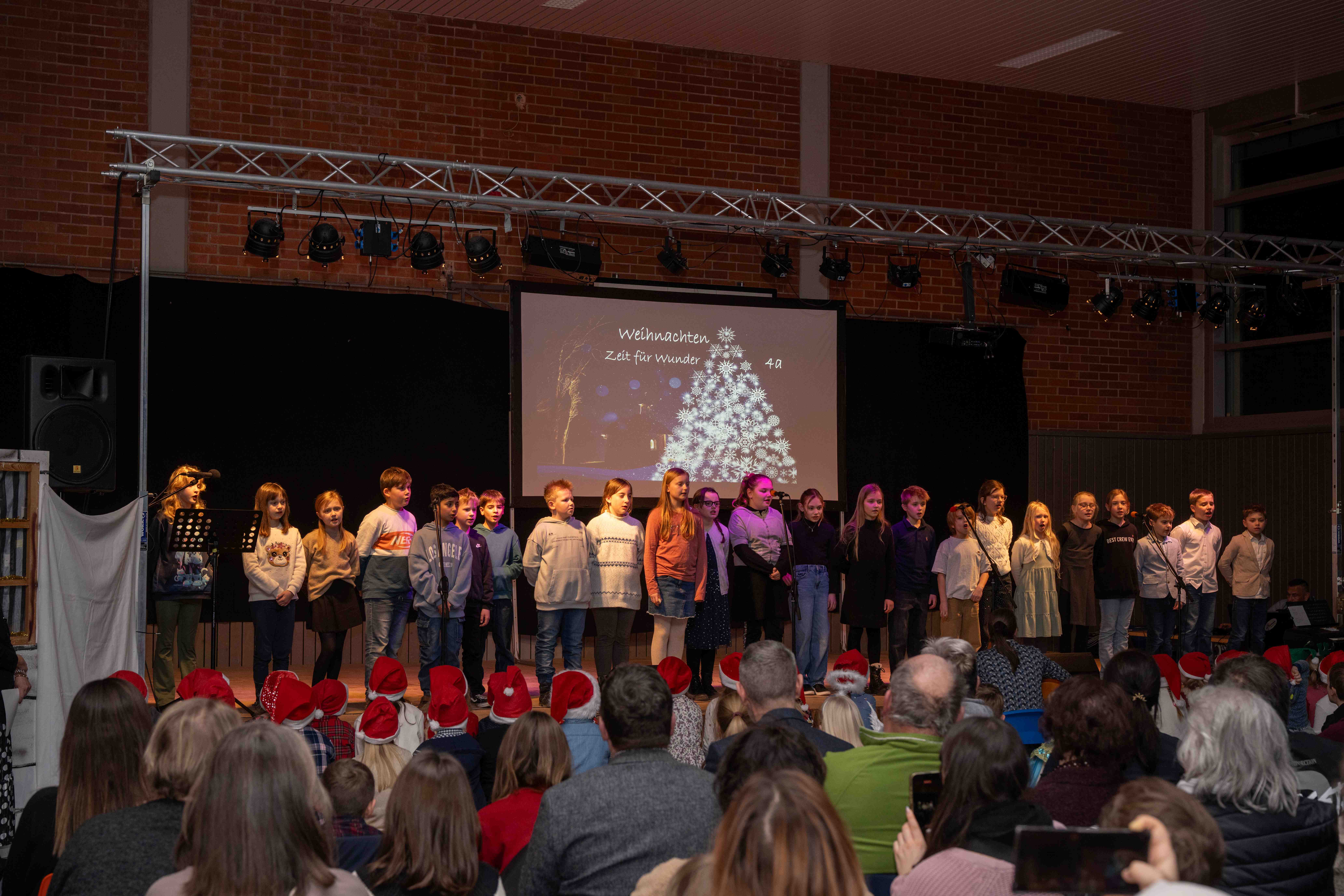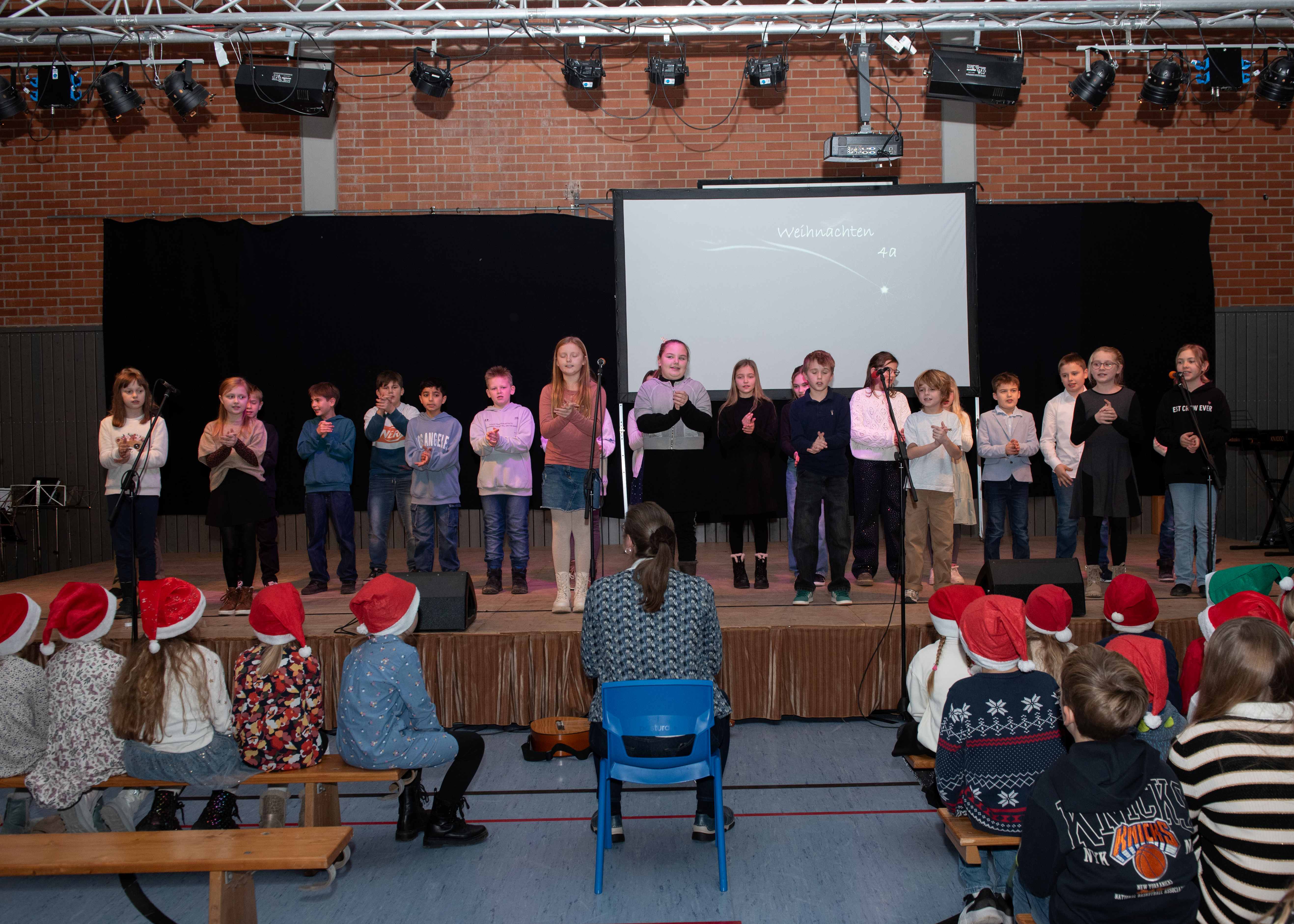 Mit weihnachtlichen Melodien der Bläserklasse begann die kleine Feier in der festlich geschmückten Turnhalle unserer Grundschule. Ein Chor aus 120 Schülerinnen und Schülern begrüßte anschließend die Gäste mit dem Lied „Tragt in die Welt nun ein Licht“ und stimmte alle auf ein abwechslungsreiches Programm ein. Die verschiedenen Klassen präsentierten traditionelle und moderne Beiträge. Die Klasse 4a erinnerte uns an die Bedeutung von Weihnachten, eine Zeit für Wunder. Einen vergnüglichen Einblick in die Weihnachtswichtelwerkstatt ermöglichte die 2. Klasse. Die Weihnachtswichtel der beiden ersten Klassen sangen und tanzten ihren Wichteltanz. Marie, Martha und Liv verzauberten uns mit Cello, Keyboard und Flöte. Das Gedicht „The Snowman“ von der Klasse 3a begeisterte das Publikum. Die Kinder der Klasse 3b beantworteten die Frage: „Eine ganz normale Nacht! ...? mit ihrem fetzigen Auftritt. Weihnachtsfreude zauberte die Arbeitsgemeinschaft Chor mit dem Bewegungslied „Nikolaus und Nikoletta“ auf die Bühne. Das besinnliche Lied vom Friedenslicht trugen Schülerinnen und Schüler der 3. und 4. Klassen vor. Zum Abschluss sangen alle gemeinsam das Lied „Oh du fröhliche“. Der gemütliche Ausklang, organisiert durch den Elternbeirat, rundete den feierlichen Abend mit köstlichen Leckereien ab. Ein herzliches Dankeschön an Frau Schwarz, für die bereitgestellten Fotos von diesem stimmungsvollen Abend!