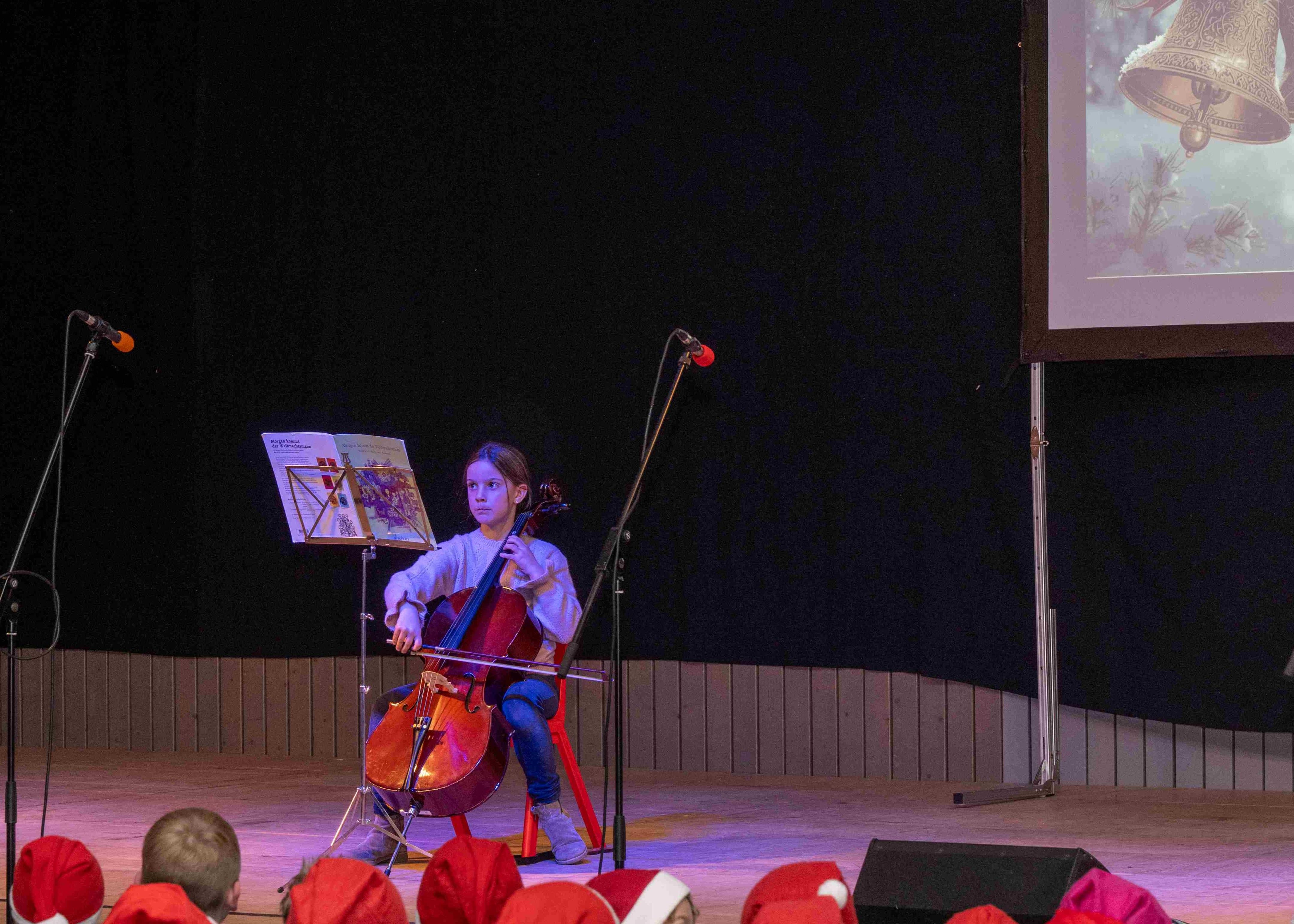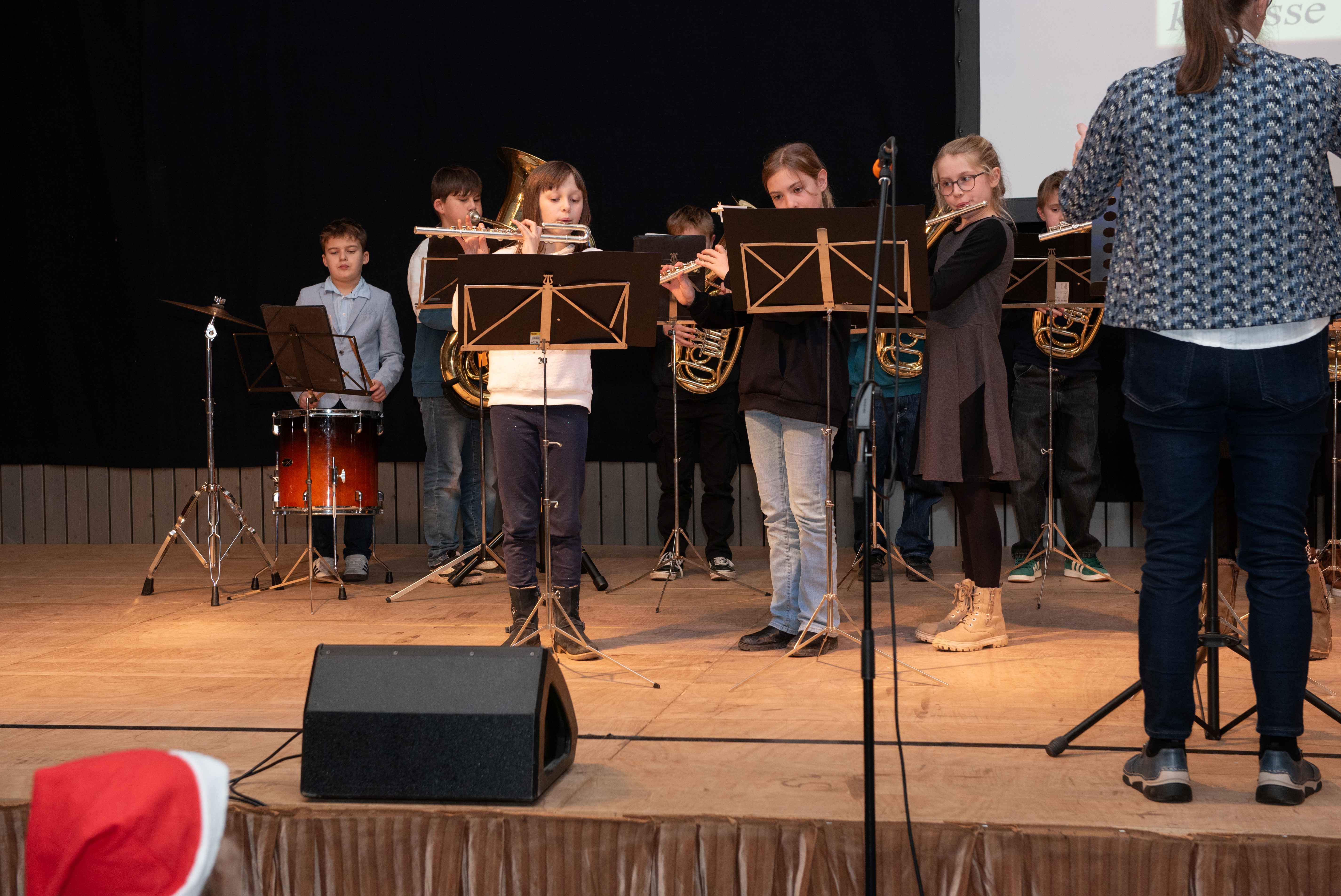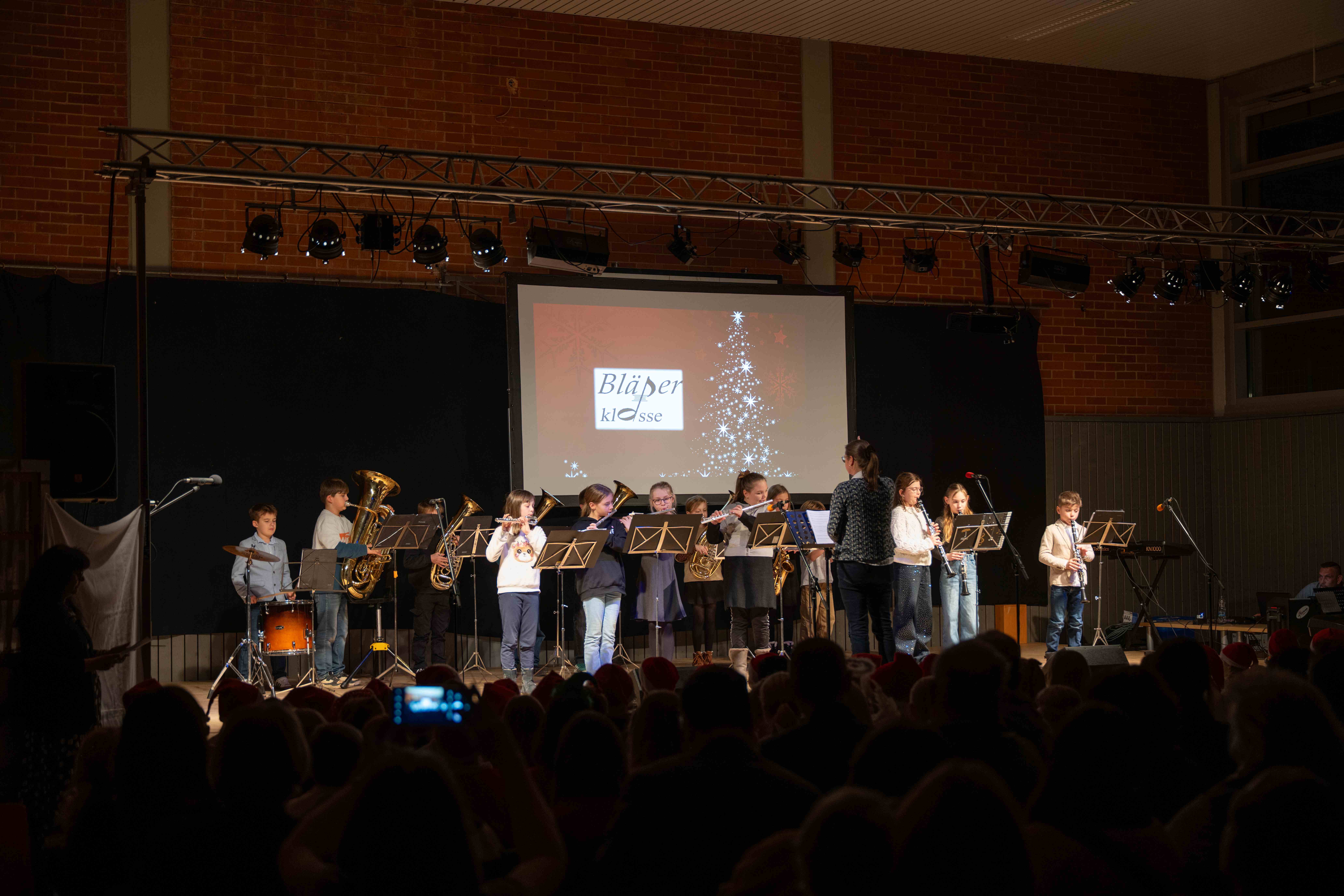 Mit weihnachtlichen Melodien der Bläserklasse begann die kleine Feier in der festlich geschmückten Turnhalle unserer Grundschule. Ein Chor aus 120 Schülerinnen und Schülern begrüßte anschließend die Gäste mit dem Lied „Tragt in die Welt nun ein Licht“ und stimmte alle auf ein abwechslungsreiches Programm ein. Die verschiedenen Klassen präsentierten traditionelle und moderne Beiträge. Die Klasse 4a erinnerte uns an die Bedeutung von Weihnachten, eine Zeit für Wunder. Einen vergnüglichen Einblick in die Weihnachtswichtelwerkstatt ermöglichte die 2. Klasse. Die Weihnachtswichtel der beiden ersten Klassen sangen und tanzten ihren Wichteltanz. Marie, Martha und Liv verzauberten uns mit Cello, Keyboard und Flöte. Das Gedicht „The Snowman“ von der Klasse 3a begeisterte das Publikum. Die Kinder der Klasse 3b beantworteten die Frage: „Eine ganz normale Nacht! ...? mit ihrem fetzigen Auftritt. Weihnachtsfreude zauberte die Arbeitsgemeinschaft Chor mit dem Bewegungslied „Nikolaus und Nikoletta“ auf die Bühne. Das besinnliche Lied vom Friedenslicht trugen Schülerinnen und Schüler der 3. und 4. Klassen vor. Zum Abschluss sangen alle gemeinsam das Lied „Oh du fröhliche“. Der gemütliche Ausklang, organisiert durch den Elternbeirat, rundete den feierlichen Abend mit köstlichen Leckereien ab. Ein herzliches Dankeschön an Frau Schwarz, für die bereitgestellten Fotos von diesem stimmungsvollen Abend!