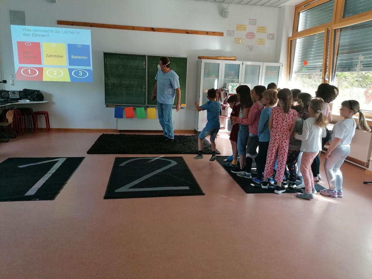 Der Thurnauer Zahnarzt Moritz Weigel besuchte mit seinem Team unsere Grundschule und machte auf spielerische Weise darauf aufmerksam, wie wichtig die Pflege und Gesunderhaltung der Zähne ist. Bei dem beliebten Ratespiel "1, 2 oder 3" mussten die Schüler verschiedene Aufgaben rund um das Thema „Zähne“ lösen. Mit viel Spaß wurden dabei fleißig Punkte gesammelt. Zum Abschied gab es für jeden ein Zahnputzset als Geschenk. Vielen Dank an das ganze Team!