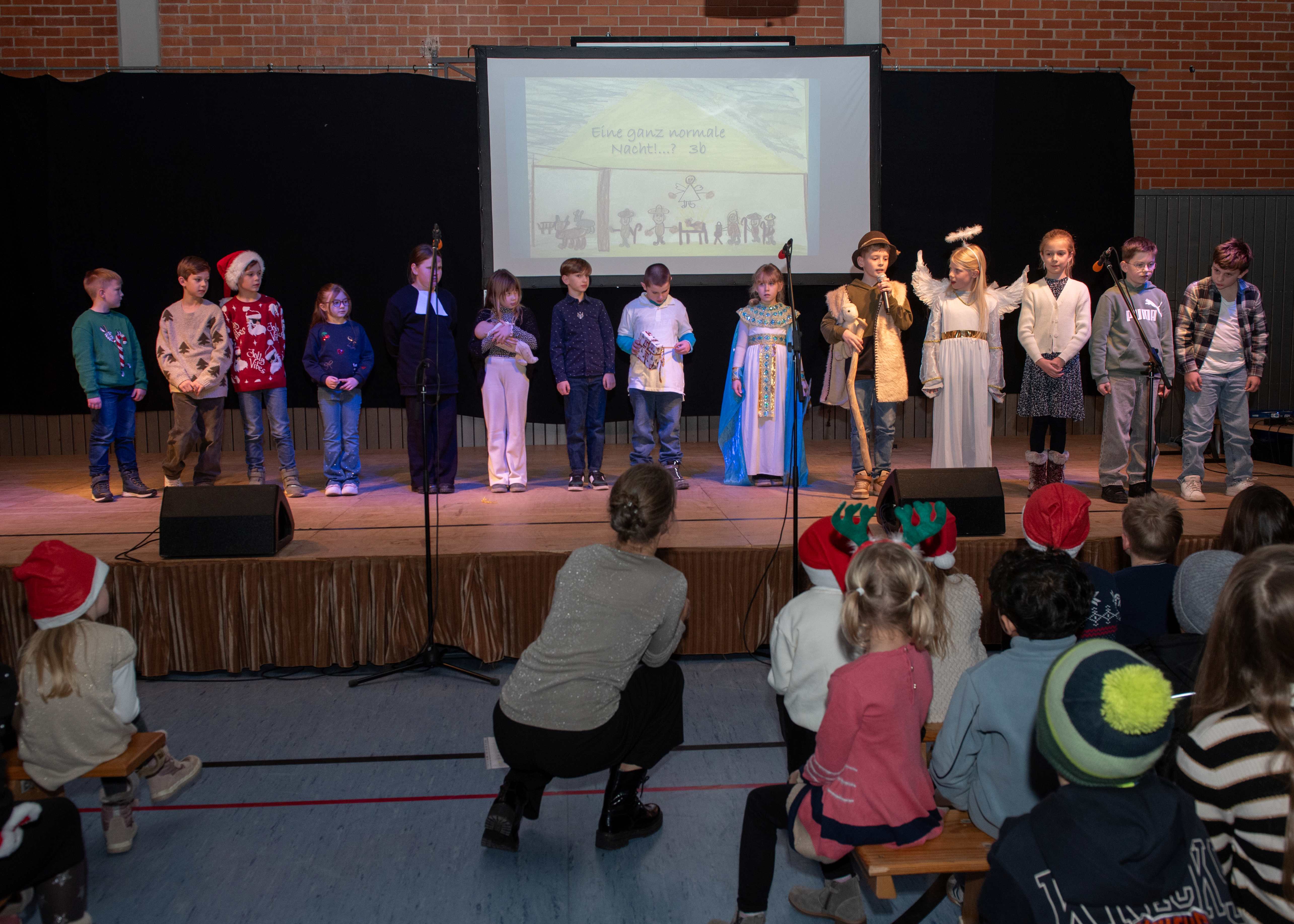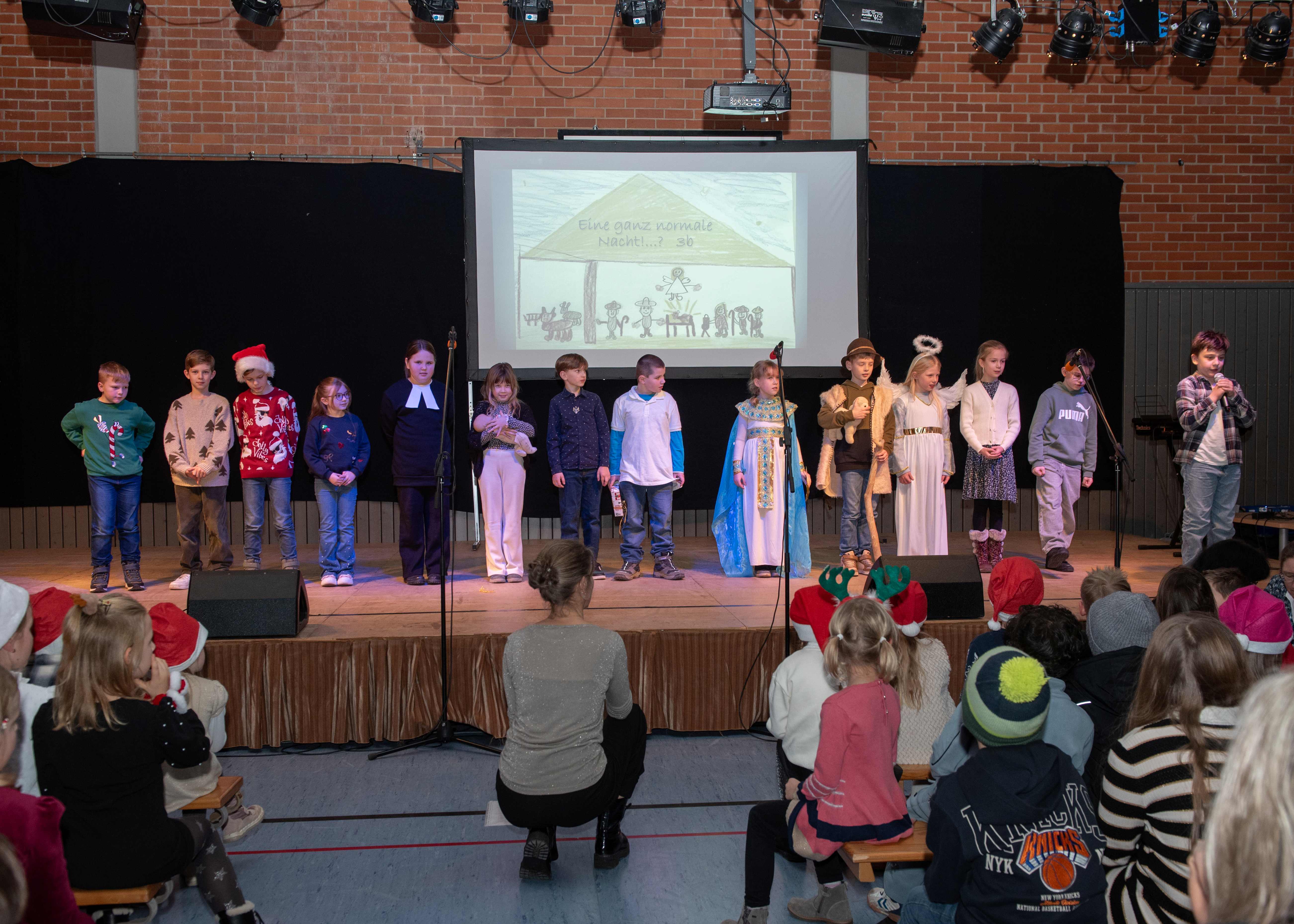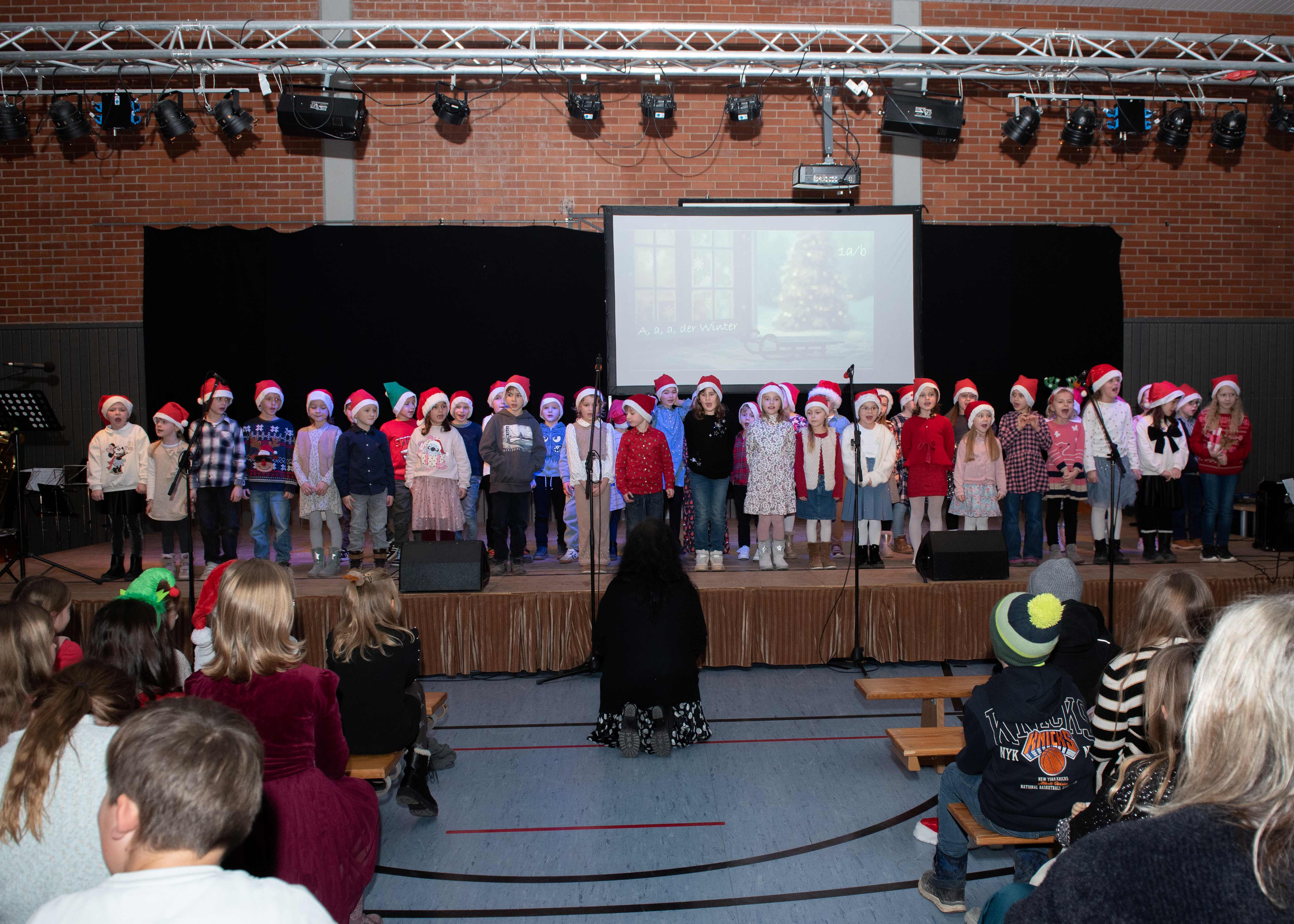 Mit weihnachtlichen Melodien der Bläserklasse begann die kleine Feier in der festlich geschmückten Turnhalle unserer Grundschule. Ein Chor aus 120 Schülerinnen und Schülern begrüßte anschließend die Gäste mit dem Lied „Tragt in die Welt nun ein Licht“ und stimmte alle auf ein abwechslungsreiches Programm ein. Die verschiedenen Klassen präsentierten traditionelle und moderne Beiträge. Die Klasse 4a erinnerte uns an die Bedeutung von Weihnachten, eine Zeit für Wunder. Einen vergnüglichen Einblick in die Weihnachtswichtelwerkstatt ermöglichte die 2. Klasse. Die Weihnachtswichtel der beiden ersten Klassen sangen und tanzten ihren Wichteltanz. Marie, Martha und Liv verzauberten uns mit Cello, Keyboard und Flöte. Das Gedicht „The Snowman“ von der Klasse 3a begeisterte das Publikum. Die Kinder der Klasse 3b beantworteten die Frage: „Eine ganz normale Nacht! ...? mit ihrem fetzigen Auftritt. Weihnachtsfreude zauberte die Arbeitsgemeinschaft Chor mit dem Bewegungslied „Nikolaus und Nikoletta“ auf die Bühne. Das besinnliche Lied vom Friedenslicht trugen Schülerinnen und Schüler der 3. und 4. Klassen vor. Zum Abschluss sangen alle gemeinsam das Lied „Oh du fröhliche“. Der gemütliche Ausklang, organisiert durch den Elternbeirat, rundete den feierlichen Abend mit köstlichen Leckereien ab. Ein herzliches Dankeschön an Frau Schwarz, für die bereitgestellten Fotos von diesem stimmungsvollen Abend!